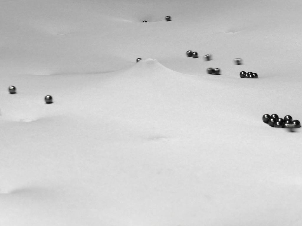 While observing the iron balls, you will notice individual behavior patterns in terms of the iron balls movements. There are loners racing over the fabric and running into others or there are groups separating rarely but having a strong cohesion. The material get part of the calculation.
