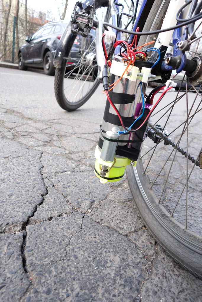 All you need to do is to attach your Phone onto your bike for tracking its motions. When hitting a bigger pothole, your phone registers the intensity and location of the bump. These data are directly sent and stored on an online platform called www.auto-complain.com. Upon arrival at your destination, your complain ride is completed and a PDF-file, which summarizes all of your complains, is sent to the department for road repair. Another feature (of the auto-complain system) is a spray device, which is mounted to your bike. As soon as you ride over a pothole, the spray device leaves a mark on the pothole to alert other cyclists.